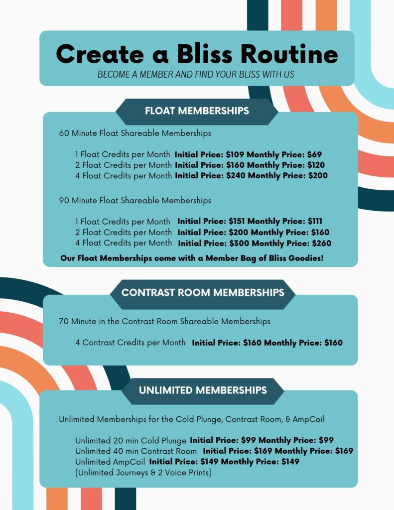 Build your perfect Float or Contrast Therapy experience by stacking services like the HRV Stress Scan, Amp Coil, Vibration Plate, BrainTap, O2 Bar and more. Mix, match, and make it yours—designed to help you relax deeply, recharge fully, and rediscover your bliss.